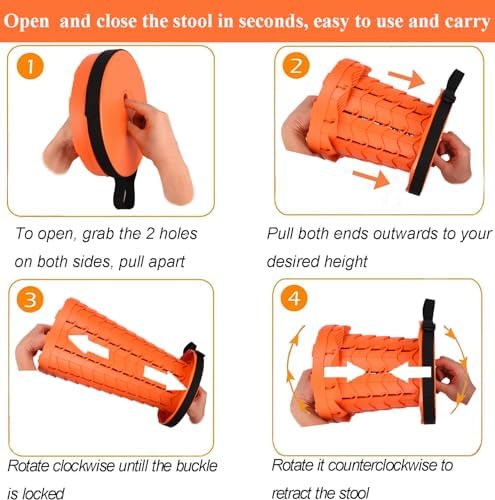 - [Easy to use,Multipurpose]:super easy to use.You can open the collapsible stool by holding both ends and pulling to open with slight turning them,perfect for indoors and outdoors.Indoor occasions such as the living room, bedroom,bathroom,kitchen,office.Outdoor activities:drawing room,garden,hiking,BBQ,camping,queue,fishing, kitchen, etc