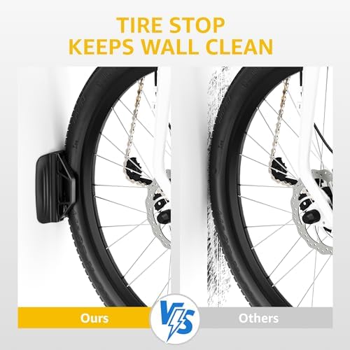 - 【Upgraded 150° Swivel Design】 Swivel design with bearing system, swivel bike rack wall mount conveniently stores bikes in center, left or right-angled position, making it a convenient storage solution around parked cars and inside apartments. The swivel system allows you to store bike flush against the wall. Just hook the front wheel in place, rest the back wheel on the stabilizer, and then rotate the bike wall hanger to the desired angle.