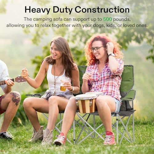 - Heavy Duty & Durable: The camping sofa is constructed with a sturdy powder-coated steel frame and two front bars that can support up to 500 pounds, allowing you to relax together with your dogs, kids, or loved ones; 600D Thick Oxford cloth ensures this portable duo camping chair is waterproof, tear-resistant, and easy to clean