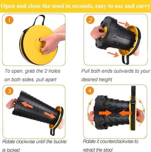 - [Easy to use,Multipurpose]:super easy to use.You can open the collapsible stool by holding both ends and pulling to open with slight turning them,perfect for indoors and outdoors.Indoor occasions such as the living room, bedroom,bathroom,kitchen,office.Outdoor activities:drawing room,garden,hiking,BBQ,camping,queue,fishing, kitchen, etc