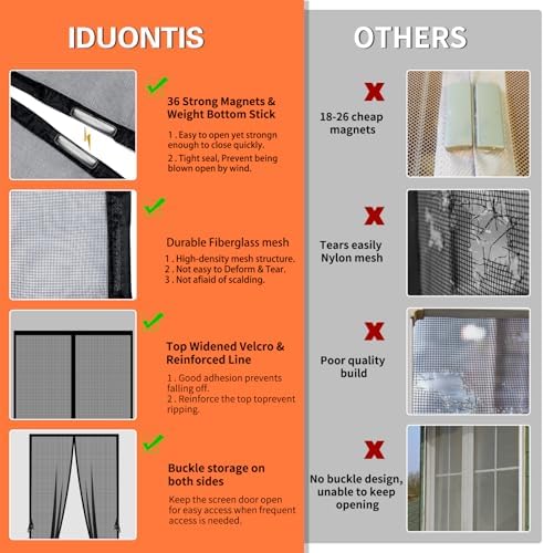 - If your door(Only door size, doesn't include door frame part) frame measures 32" or less in width and 80" or less in height, this Iduontis hanging magnetic screen door is also suitable for you! Important: Measure your door before ordering to be sure our screen doors will fit.