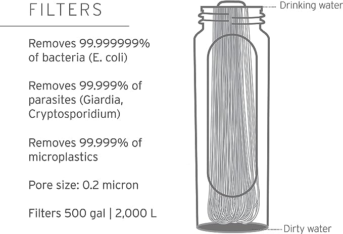 - PROTECTS AGAINST 99.999999% of bacteria (including E.coli and Salmonella), 99.999% of parasites (including Giardia and Cryptosporidium), 99.999% of microplastics.