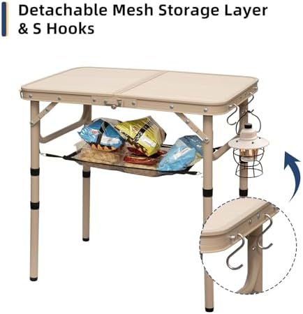 - Extra Storage Space: The portable camping table with mesh storage tier and S hooks provides more space. When camping, you can put some small kitchen tools, snacks, flashlights on the mesh tier. The S hooks can to be hanged speakers, equipment,etc