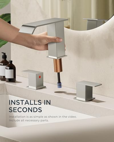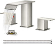 - MODERN AESTHETICS: Square waterfall bathroom faucet combines strength and soft beauty, has both modern and natural aesthetics. Suitable for a 3 hole 6-12 inch center sink, and the best installation effect is 6-10 inch. The size is larger, please check your sink hole