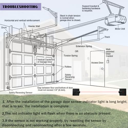 - Note: We come with an installation manual, after the installation is complete, you need to observe the two indicator lights are long bright that is, the installation is complete and can be used normally. When there is an obstacle blocking, the red indicator light will flash. Tip: Before installing the garage door sensor, please make sure the garage door remote control receiver is not powered on.