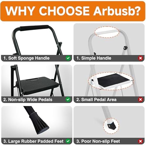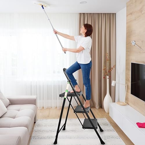 - 【SAFE & STURDY】Our 3 step ladder made with high-quality steel and a durable construction. Metal safety buckles are automatically locked in place when you use the step ladder
