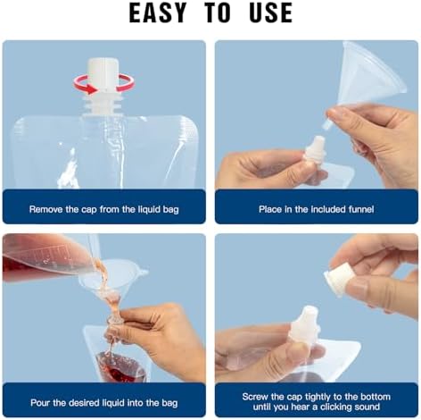 - Practical Design:These reusable drink pouches are equipped with leak-proof screw caps with locking mechanism that help tight seal without leakage, and the funnel can help liquid transfer. They are leak-proof, lightweight,compact and the specially treated smooth edges make you easily carry them in pockets, purses, backpacks or jackets