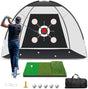 - 【Multi-target Golf Practice Net】10 x 7ft golf net is set with a central target and 4 target pockets , which is carefully designed to improve your accuracy and skills. Our golf hitting net set also comes with a 3-in-1 turf golf mat, 5 golf balls, 1 rubber tee, 1 large-capacity carrying bag and 4 ground stakes. A variety of targets help players focus on all aspects of swinging, chipping, hitting and driving.These are ideal golf accessories for men/women.