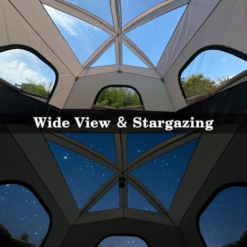 - 【Excellent Views & Ventilation】The top of our cabin tent uses a large area of mesh to give you a better view while ventilating, when the top rainfly is removed at night, this tall tents for camping can also be used as a stargazing tent. The tent is equipped with 5 large windows, which can quickly take away the heat out of the tent and give you a better camping experience.