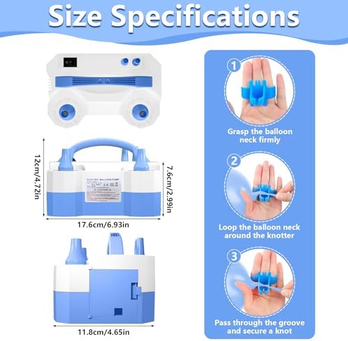 - 【Balloon Pump Electric】Product Dimension:7.2"x5.1"x5.1", Product Weight: lbs.Input voltage:110-120V. Frequency: 50/60Hz. Air Volume 300 (L/min). Motor Power: 600W. Noise: <95dB. This balloon inflator pump is portable and designed with an easy-to-grip handle. This air balloon inflation offers both manual (press-on) and automatic pumping modes and fits Latex balloon
