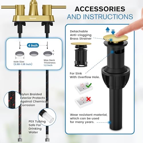 - Package Included: SUS304 Stainless Steel Brushed Gold Bathroom Faucet & Solid Metal Pop-up Drain & Certified Water Inlet Hoses