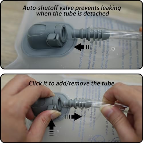 - UPGARDE LEAK PROOF:Soft yet durable mouthpiece with easily accessible ON/OFF valve non-leaking. You can control the water flow by biting, First pull up on the drinking cap, gently bite the mouthpiece with your front teeth to have a sip and start drinking, push back to stop water flow.Quick-release tube is detachable. Auto shut off while the tube is removed, the hydration bladder will stay filled non-leaking. The water storage reservoir also has a dust cover to keep dirt out.