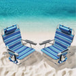 5-Position Aluminum Lay Flat Tall Backpack Beach Chairs 2 Pack, Compact Portable Beach Chairs for Adults with Cooler Pouch, Storage Pouch, Towel Bar, Cup Holder & Phone Holder, Blue Stripe