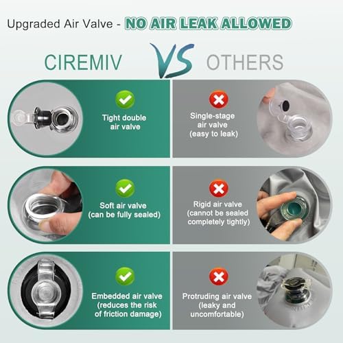 - đăUpgraded Valves Maximize Leak PreventionăOur car mattresses for back suv is equipped with a dual-layer air valve + the soft material of the air valve allows for easy closure, further enhancing the airtightness and preventing any unwanted deflation. Moreover, the design of the air valve allows it to be embedded within the backseat bed, ensuring that it does not interfere with the overall comfort and plushness of the car inflatable bed.
