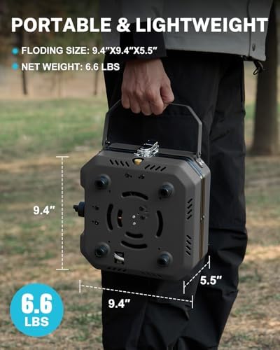 - 【Portable Camping Stove】The camping stove is foldable with handle and featuring a compact 9.4”x9.4”x5.5” design and weighing only 6.6 lbs is easy to transport and store. The package include 1 camping stove, 1 Teflon Coated Griddle, 2 Cast Iron Grill Grates and 1 Propane Hose (Use Only Propane Cylinders)