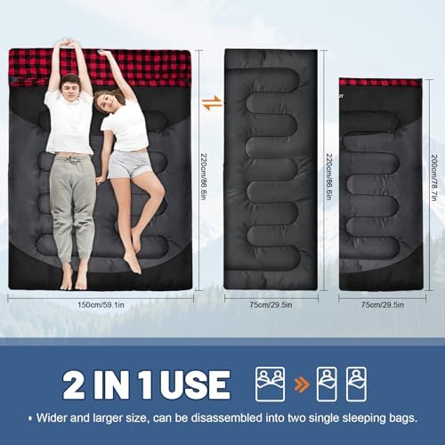- Size and Temperature Range: With dimensions of 59.06" (W) x 86.61"(H), this sleeping bag is suitable for individuals under 6 feet tall and fits full & queen-sized beds. Featuring 300gsm filling, this two-person sleeping bag for cold weather offers a comfortable temperature range of 49F-59F.