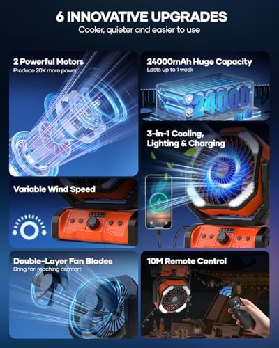 kejector Portable Camping Fan Rechargeable - 23000mAh 3-in-1 Battery Powered Fan with LED Lights, USB C, Auto Oscillating Portable Fan for Tents, Travel, BBQ, Fishing, Home, Office, Camper Essentials is backordered and will ship as soon as it is back in stock.