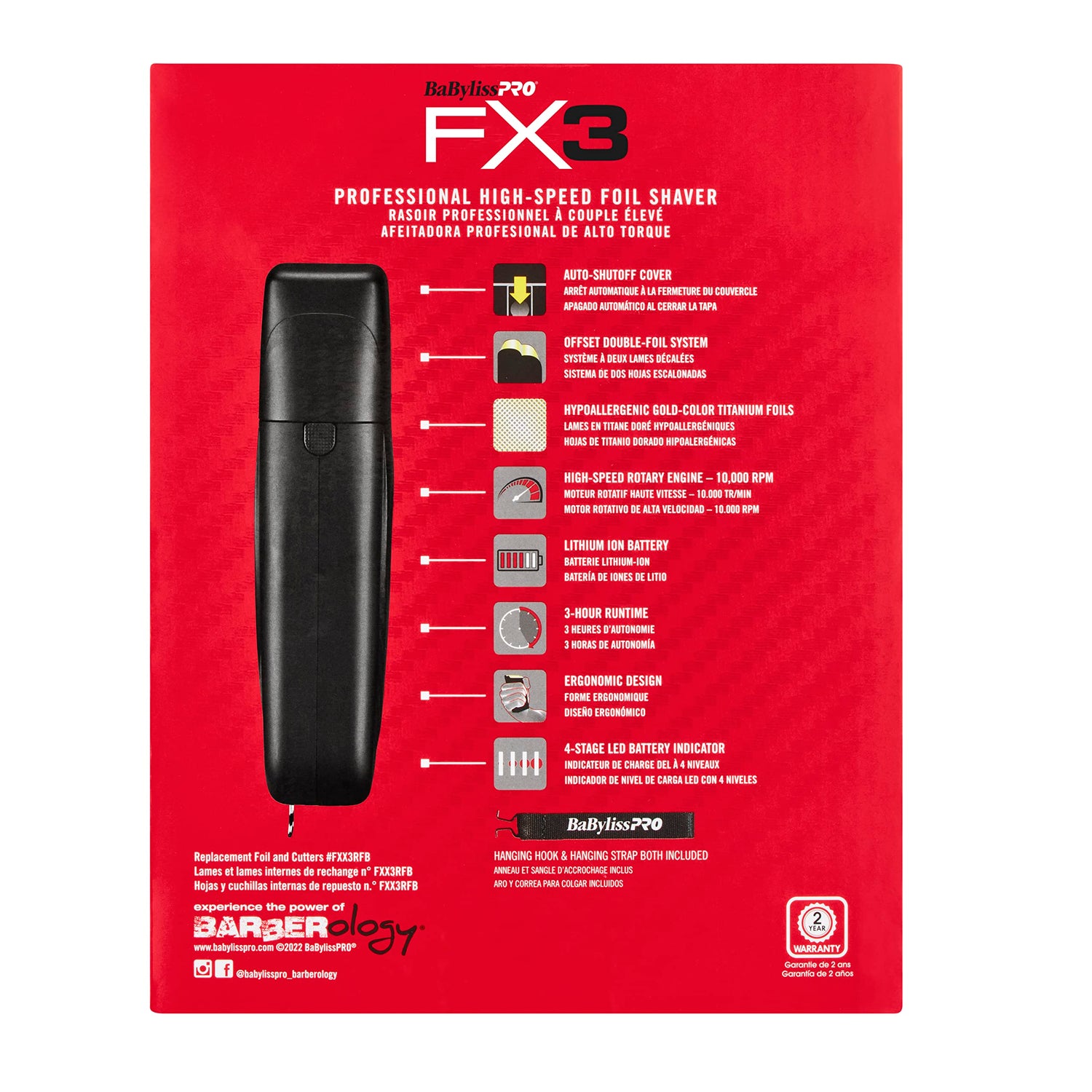 Details: The FX3 Collection is the 3rd generation of Italian-powered products from BaBylissPRO. The foil shaver features advanced high-speed motor, ultra-sleek ergonomic European housing, and unique embedded cardon texture grip surface.