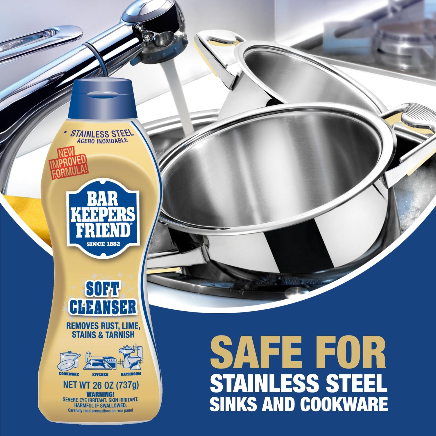 - Multi Purpose Cleaner: Bar Keepers Friend Soft Cleanser keeps life simple. The thick pre-mixed formula clings to every surface - even verticals and stainless steel - to remove rust, stain, scum, tarnish and grime. Use it in the kitchen, bathroom and for cookware