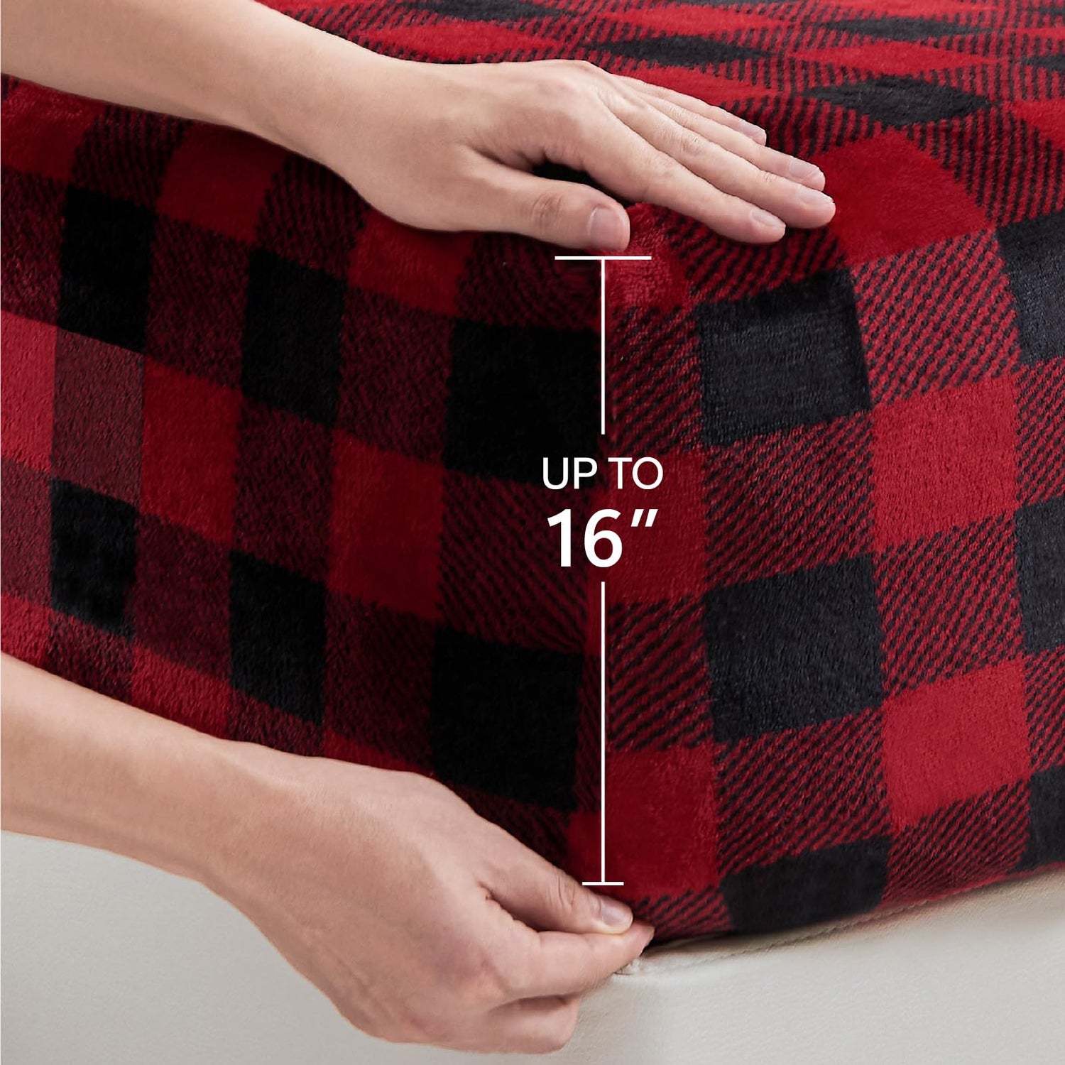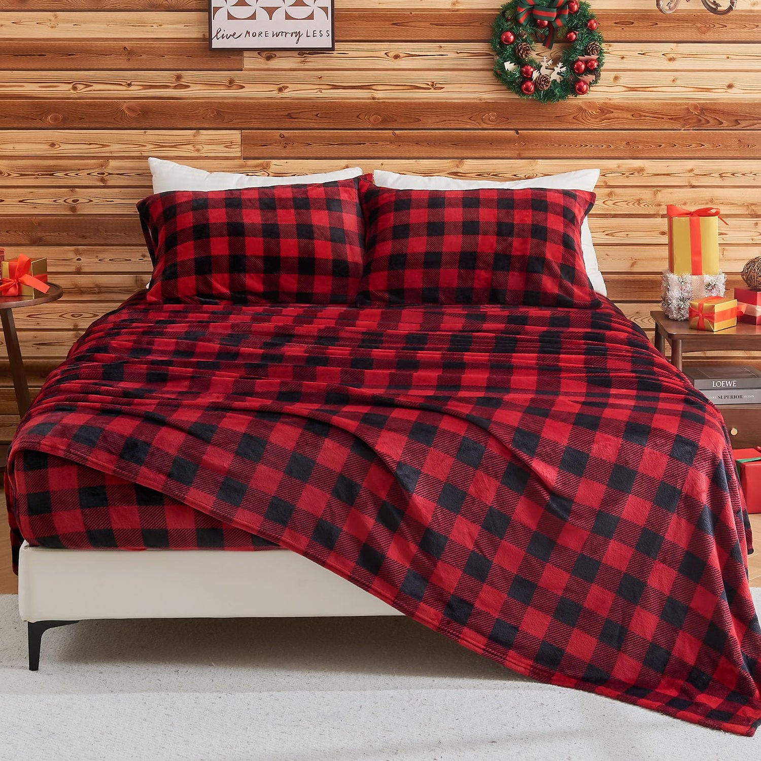 BEDELITE Flannel Sheets Queen Size Bed Set, Luxury Red and Black Plaid Christmas Bedding Set, Super Soft & Warm Fuzzy Fleece Sheets 4 Piece(Include Fitted Sheet, Flat Sheet, 2 Pillowcases)