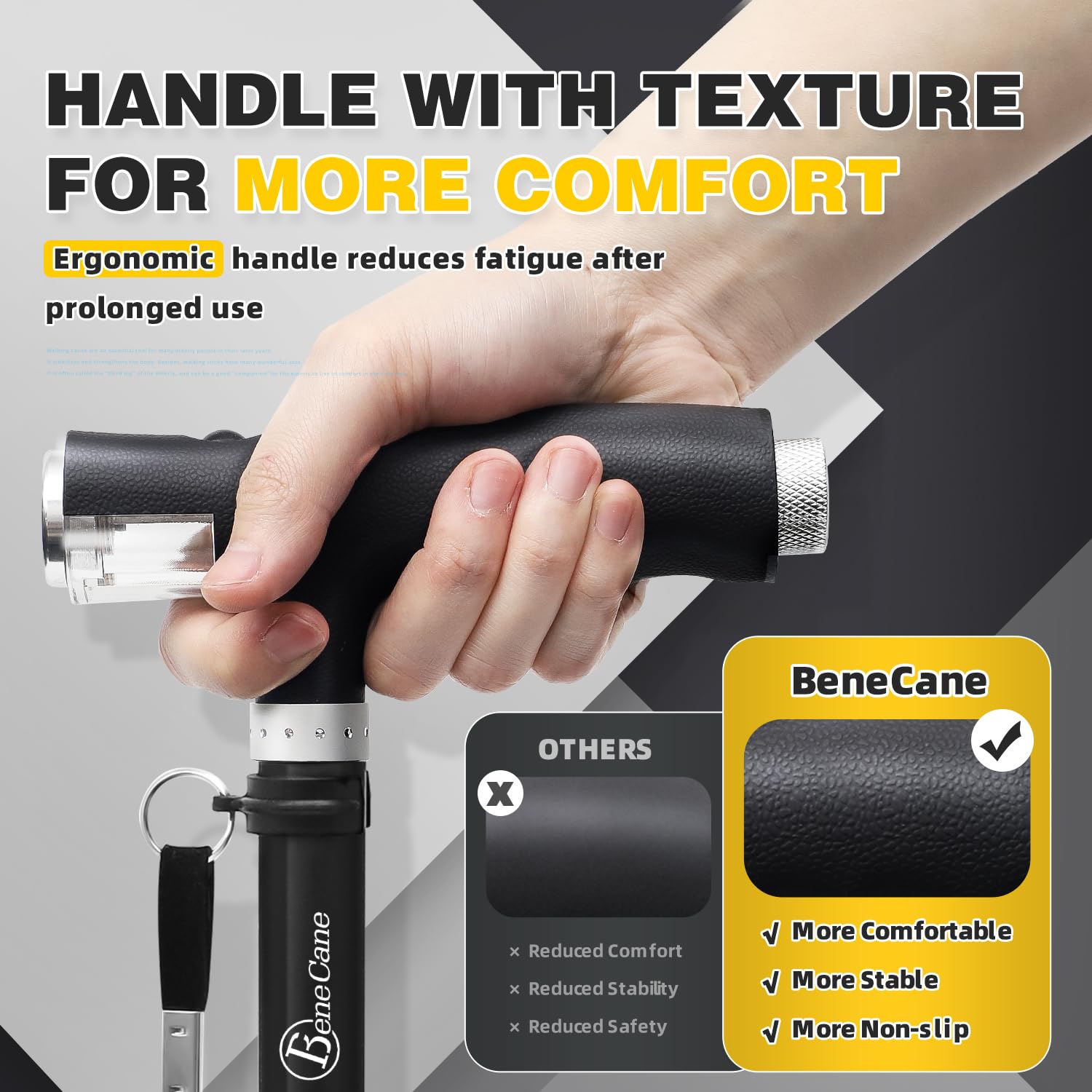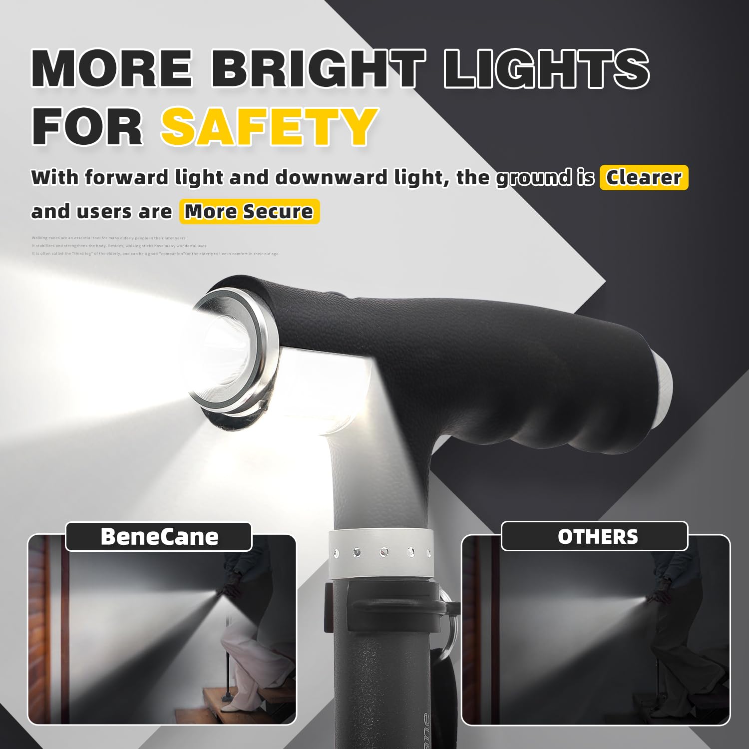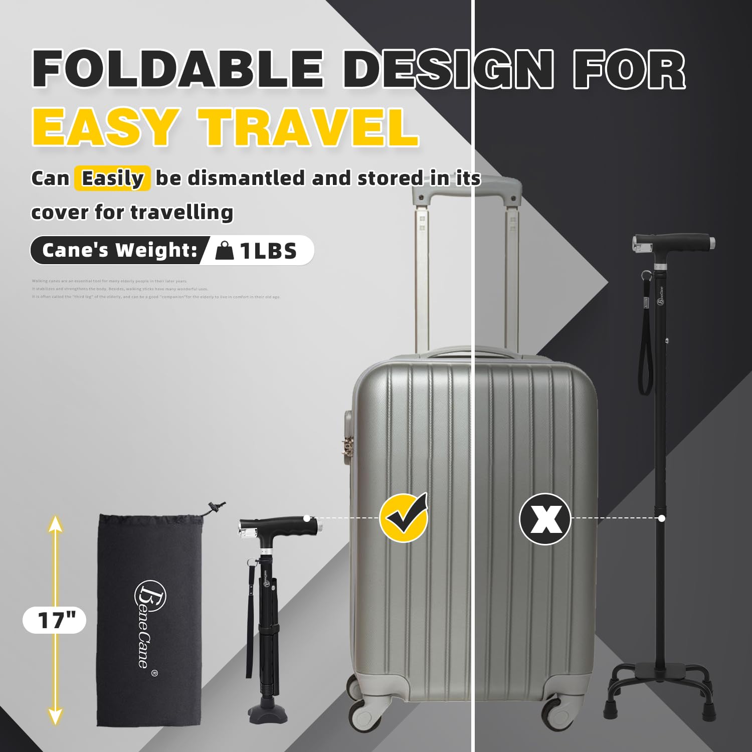 BeneCane Walking Cane for Women Folding Cane for Men with Two Led Lights Quad Cane with Stable Base Lightweight and Adjustable Walking Stick