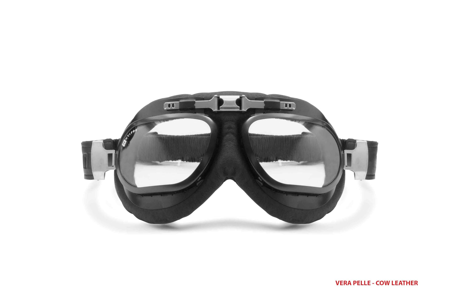 - Motorcycle Vintage Aviator Goggles made in black leather - Lens' profiles made in stainless mat black steel - Air Control System, Anti-misting aerators into top and bottom of frames