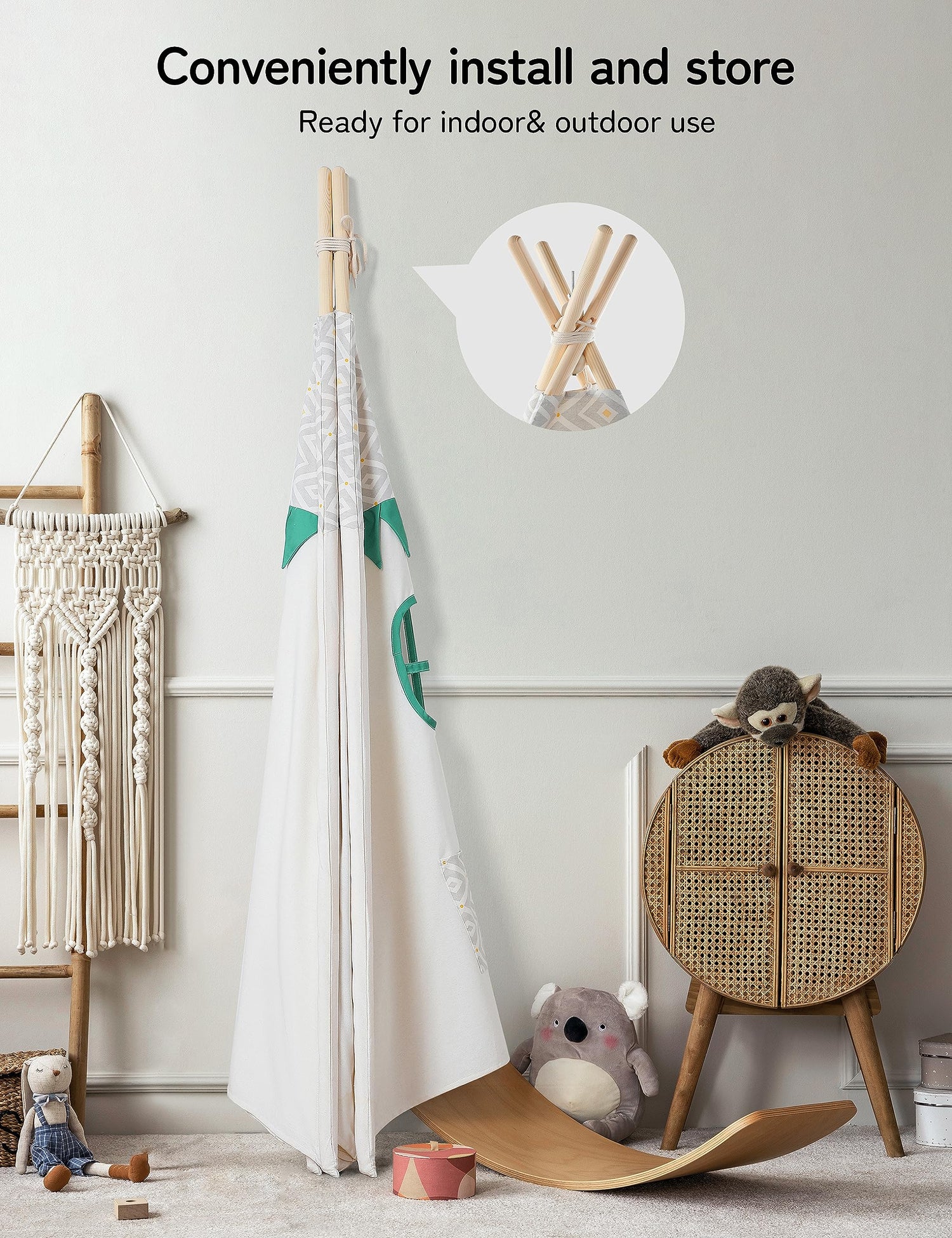 - Easy to Assemble & Reliably Sturdy: The easy setup is a significant feature. It can be assembled and packed up quickly and easily. The top connects with a teepee tent stabilizer, which can effectively prevent the TIPI from spontaneously collapsing when playing. All-cloth-wrapped design in the bottom of the tent for extra stability and less chance of slipping or collapsing