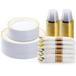 - ELEGANT DESIGN - featuring classic white plates adorned with timeless gold rims, effortlessly integrate into any event, resembling authentic ceramic plates. These disposable plates and gold silverware sets exude a classic, timeless aura, much like the cherished memories they help create for guests.