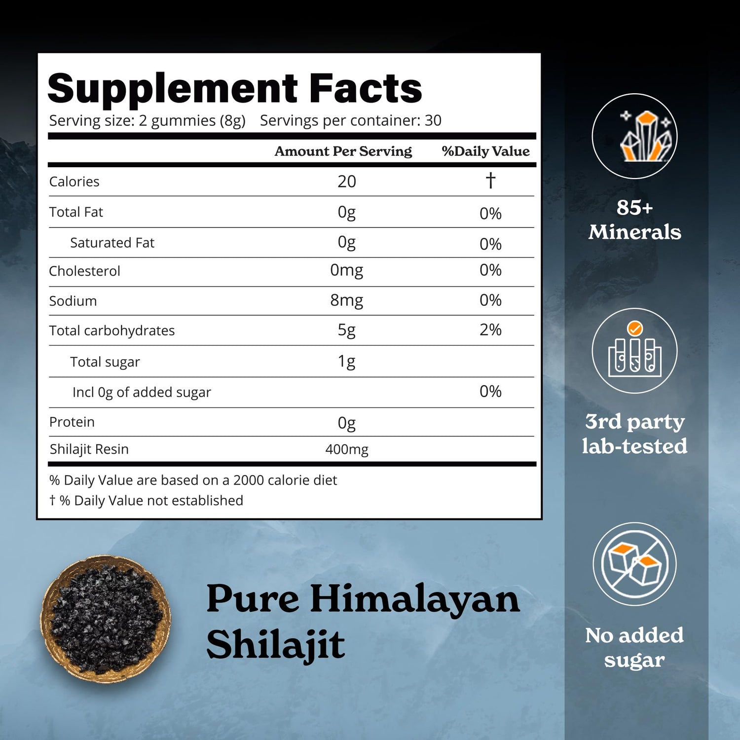 - Energy Boost & Immune Support: Our pure himalayan shilajit gummies are meticulously crafted with over 85 trace minerals that work synergistically to naturally enhance your energy levels and fortify your immune system. Say goodbye to fatigue and hello to sustained energy throughout your day.