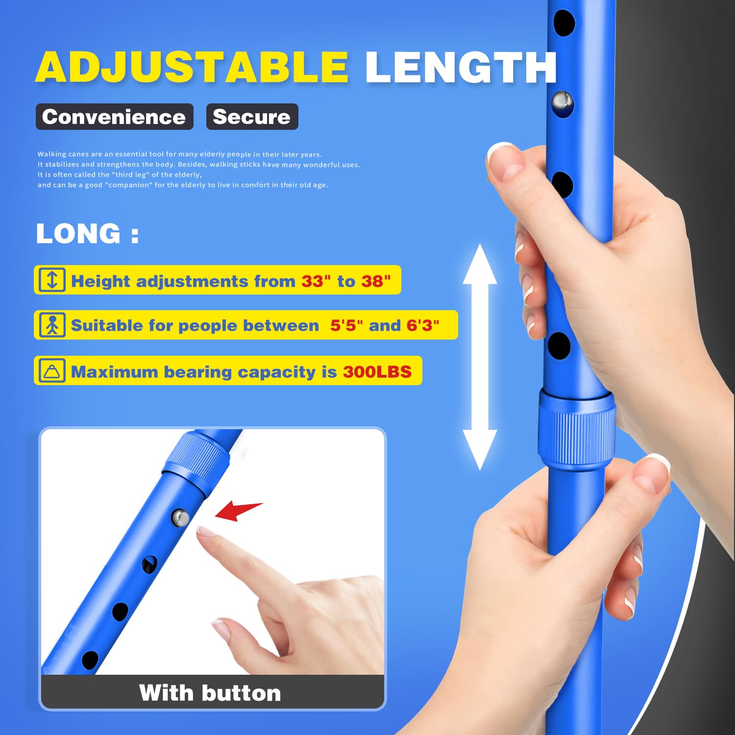 - Adjustable Height: Our canes come in two lengths and can be easily adjusted at the touch of a button. The long cane can adjust the height from 33" to 38", which is probably suitable for most people between 5'5" and 6'3"; The shorter version can adjust the height from 30" to 35", which is probably suitable for most people between 4'9" and 5'6"