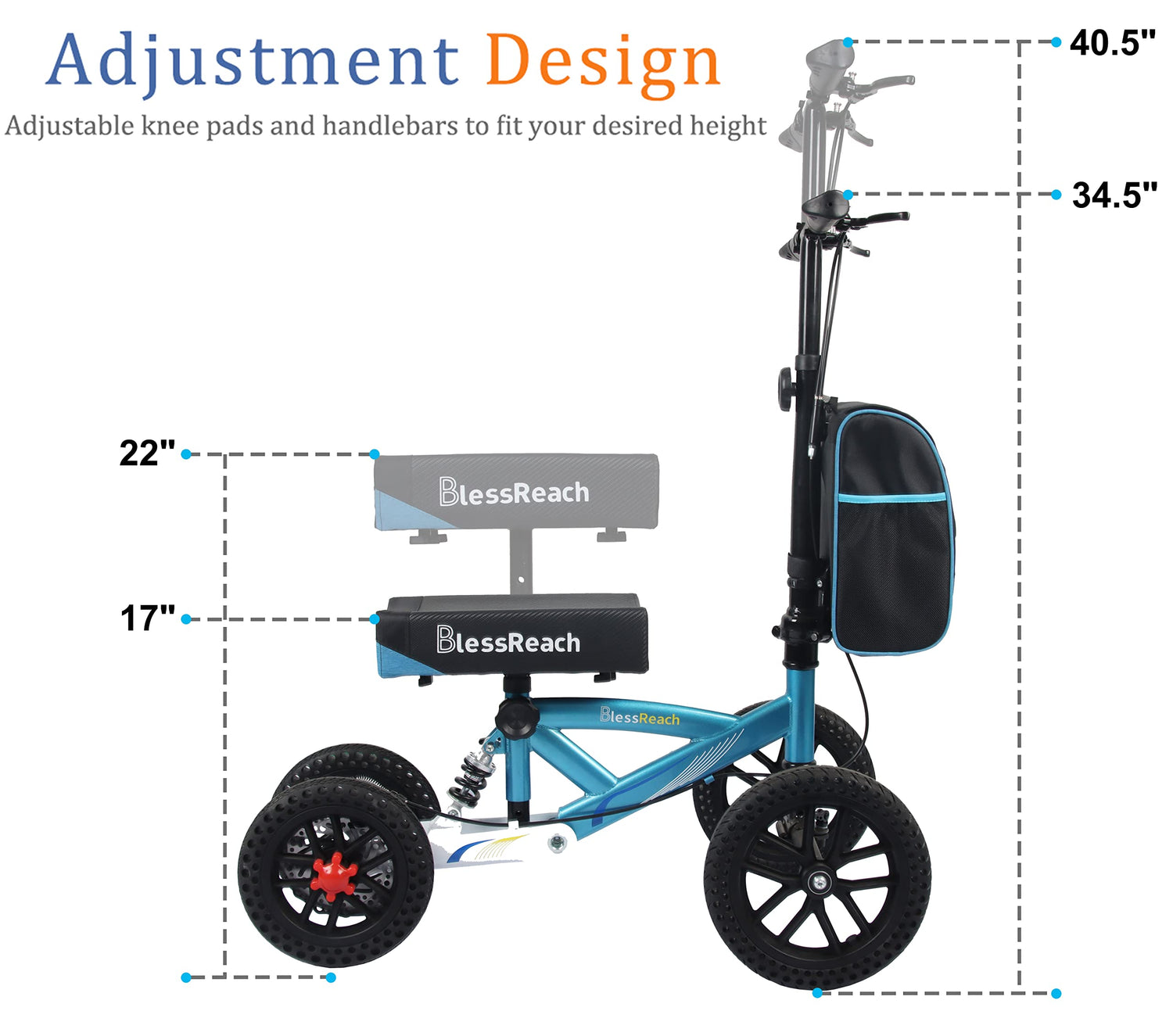 - 【ADJUSTABLE AND FOLDABLE DESIGN】BlessReach off-road scooter cane replacement offers six-level adjustable knee pads and handlebars, and is recommended for users who are 5'6" to 6'6" tall. The folding knee scooter also features handlebars with a quick release folding mechanism for easy transport and storage.