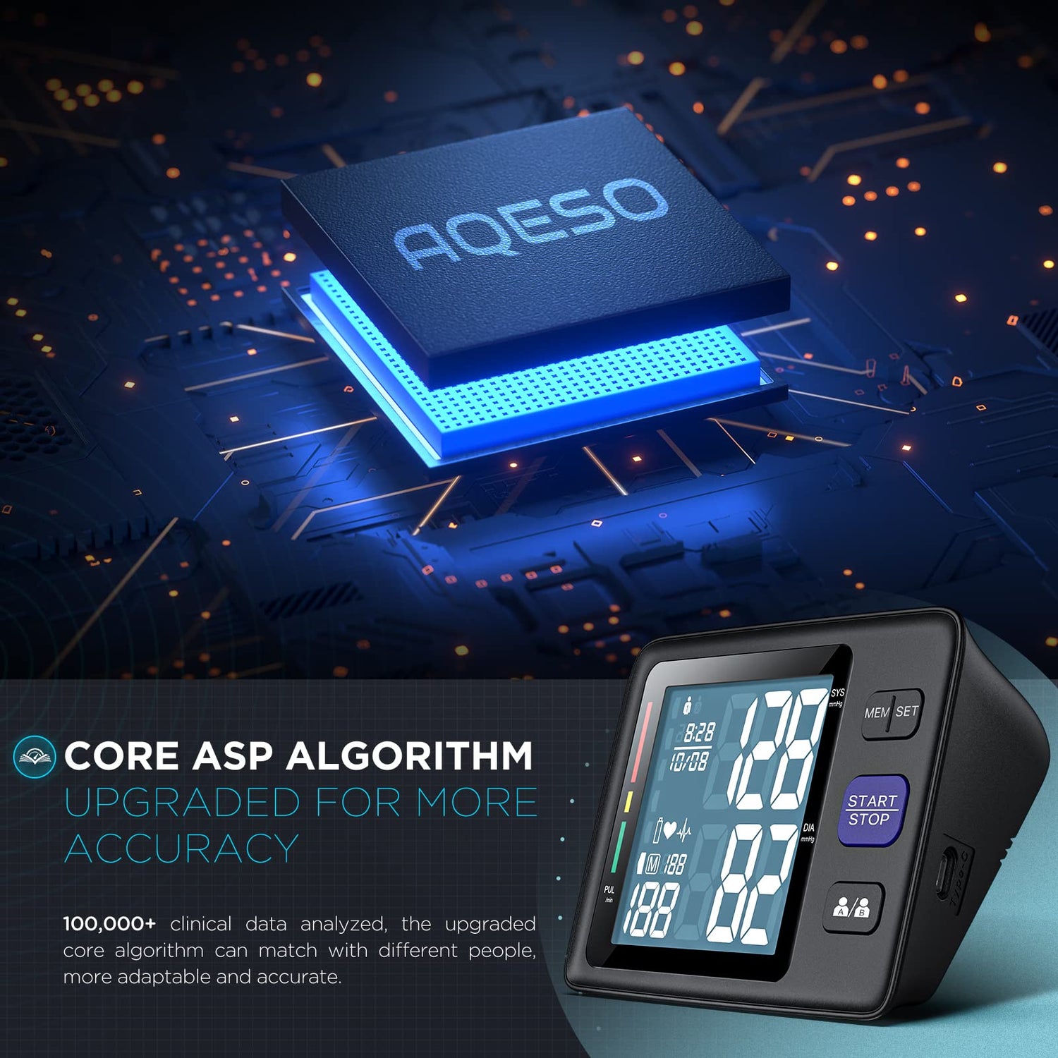 - Accurate & Fast Reading - AQESO automatic blood pressure cuff arm features with upgraded ASP (Accurate Signal Processing) technology. More accurate and faster to get readings within 30s. 100,000+ data are tested for its reliability and calibrated to the best performance. Rest assured to detect hypertension issue by the colorful WHO classification bar.