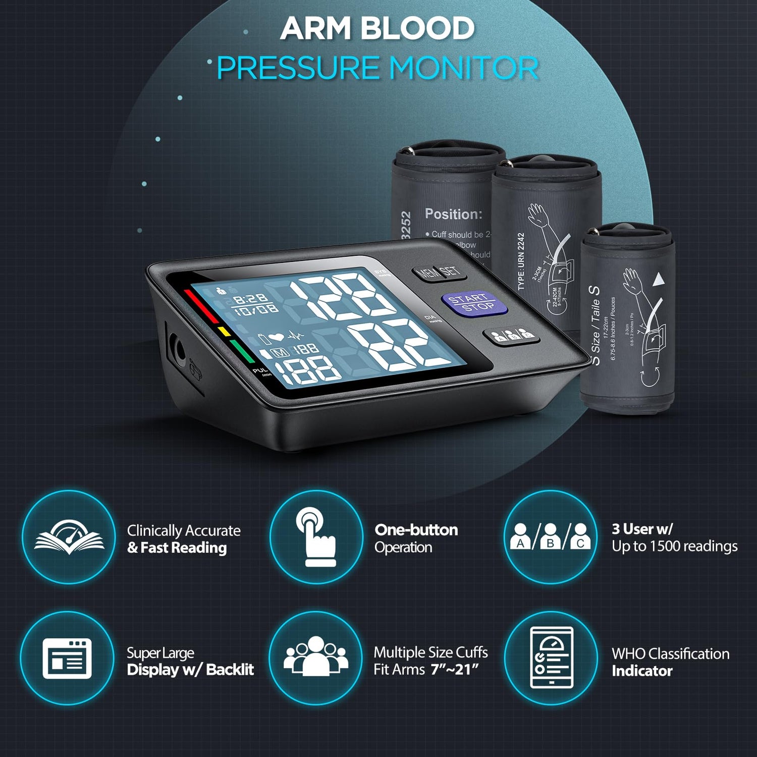 Blood Pressure Machine Upper Arm, 3 Size Cuffs, S, M/L and XL, Small 7"-9", Medium/Large 9"-17" and Extra Large Cuff 13"-21", Accurate Automatic Digital BP Monitor, Large Backlit LCD, 3-User 1500 MEM