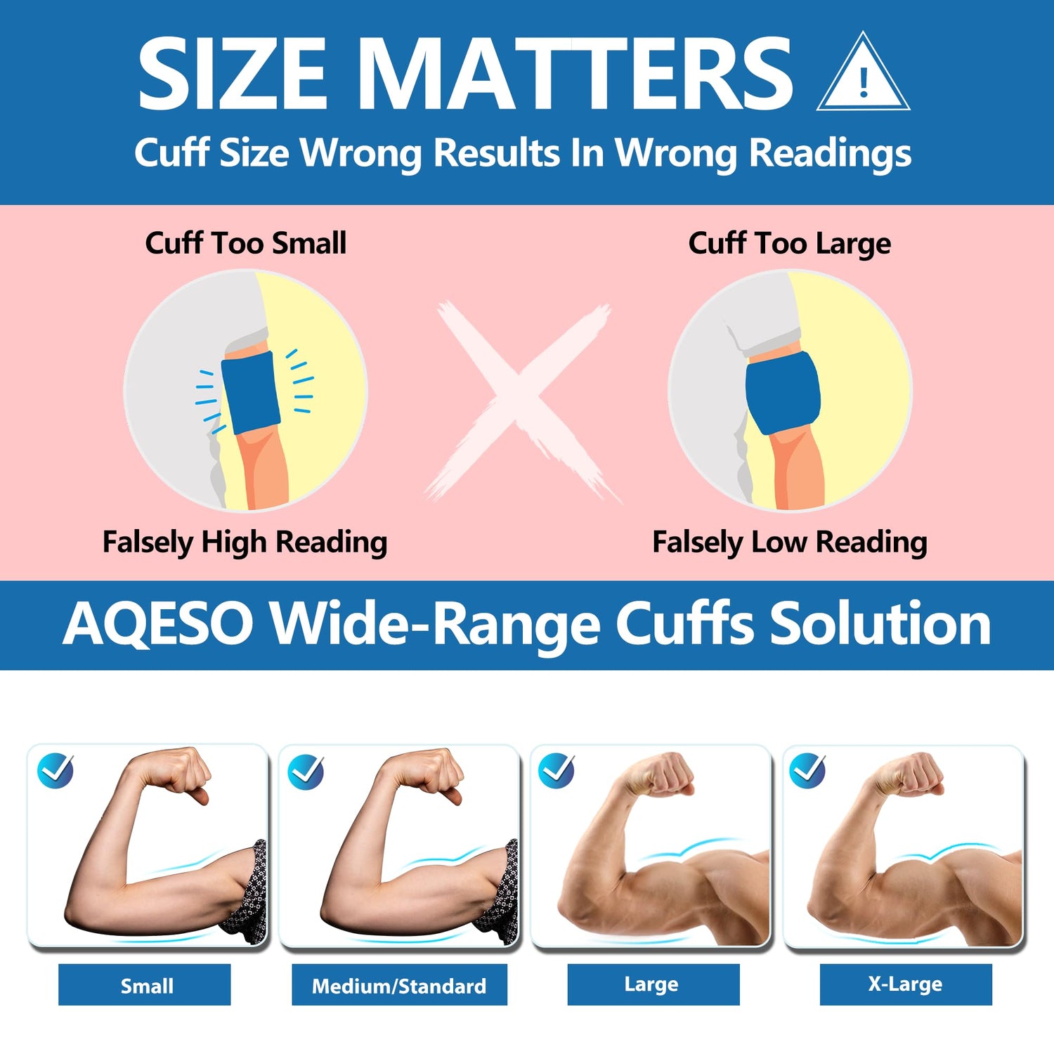 - Tips for Accurate Blood Pressure Readings - Consider three key factors: proper body position for measuring, BP machine with proven accuracy, and well-fitted cuff. AQESO BP machine with ASP signal processing tech, 100,000+ clinical data tested, can deliver readings accurate and fast. To achieve greater accuracy, AQESO wide-range cuff solution offers cuffs for arms ranging from 7" to 21" in Small, Medium/Large & XL sizes, ensuring comfortable fit for all.