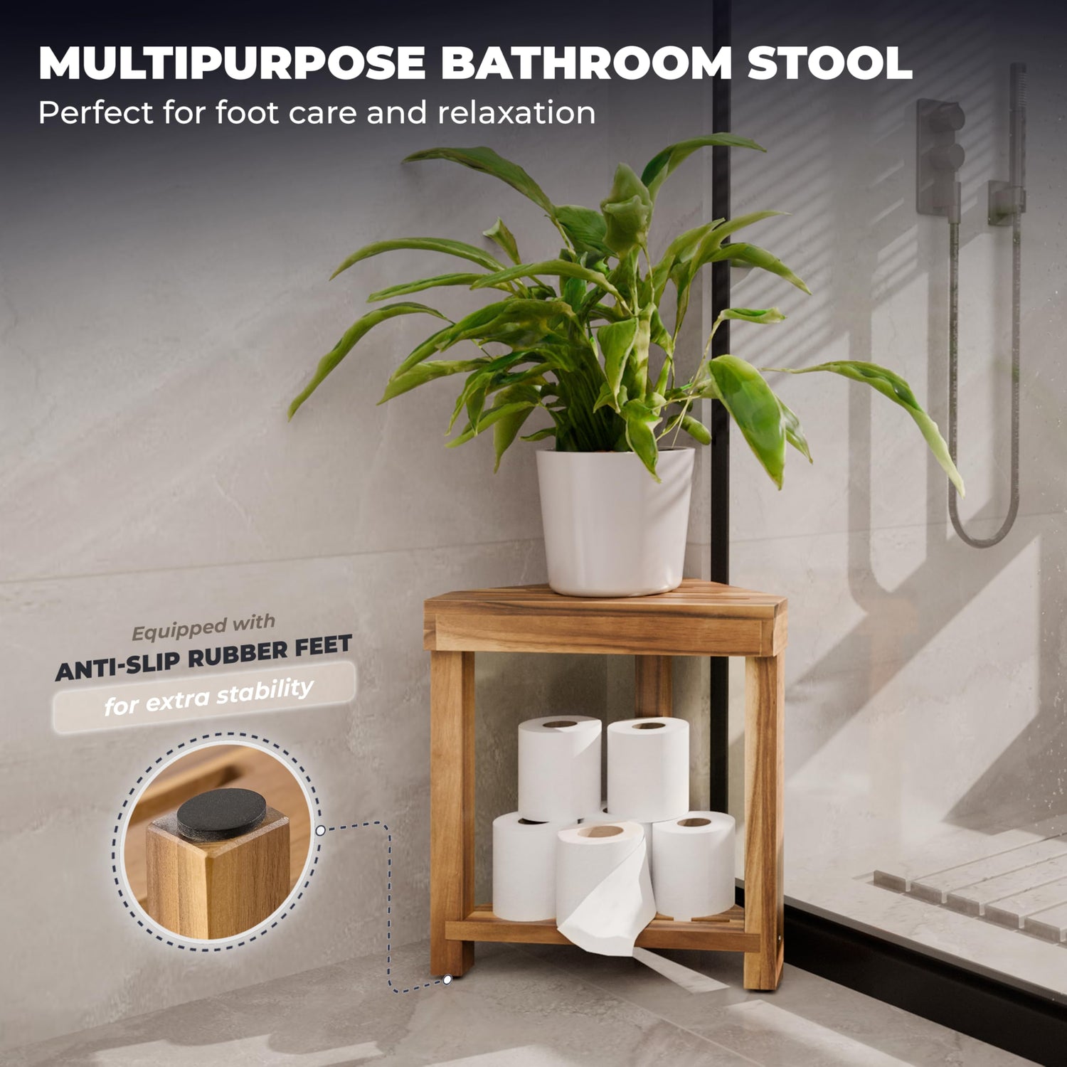 - 🛁 DUAL-FUNCTION DESIGN – Designed for convenience and versatility, this corner shower stool features a comfortable footrest for shaving and foot care. The spacious lower shelf provides a practical storage solution for towels, shampoos, or bath essentials, keeping your bathroom tidy and organized.