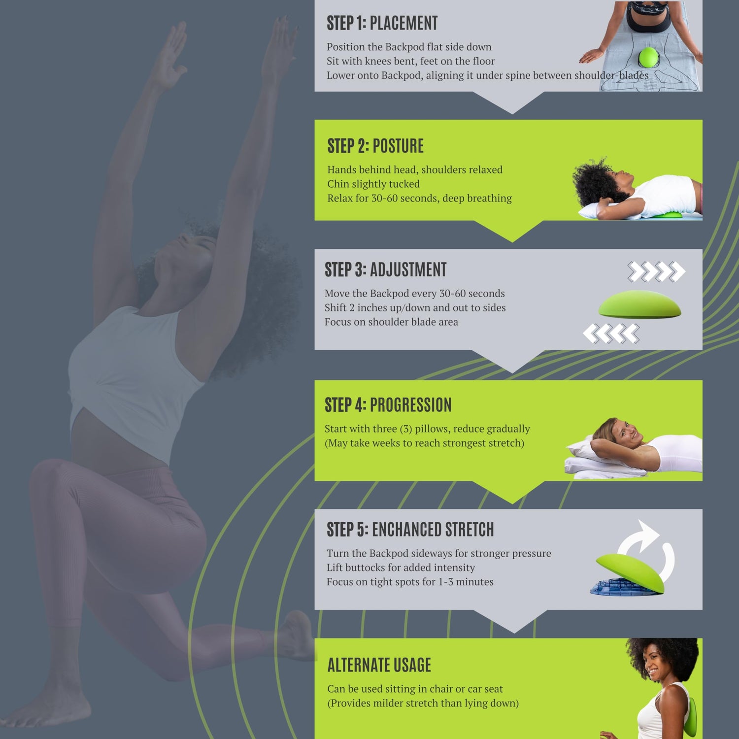 - Posture Improvement - Through regular use, it facilitates gradual spine realignment, aiding in the restoration of a natural, pain-free posture. It increases breathing capacity and reduces tension, enhancing overall well-being of users.