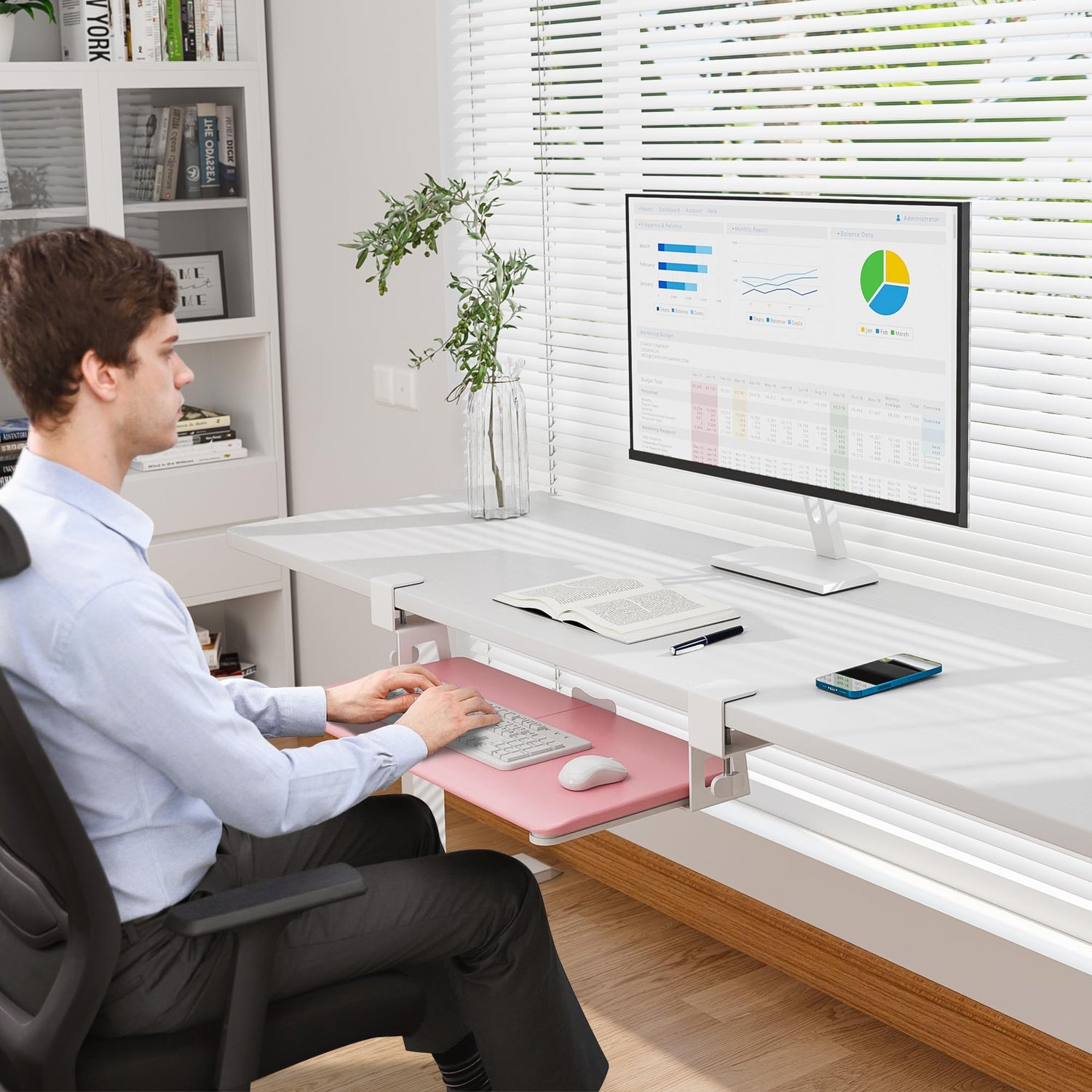 BONTEC KMT01 Under Desk Keyboard Tray, Pull-Out Keyboard & Mouse Platform with C-Clamp, 25.6 x 11.8 in Space-Saving Ergonomic Slide-Out Drawer, Pink