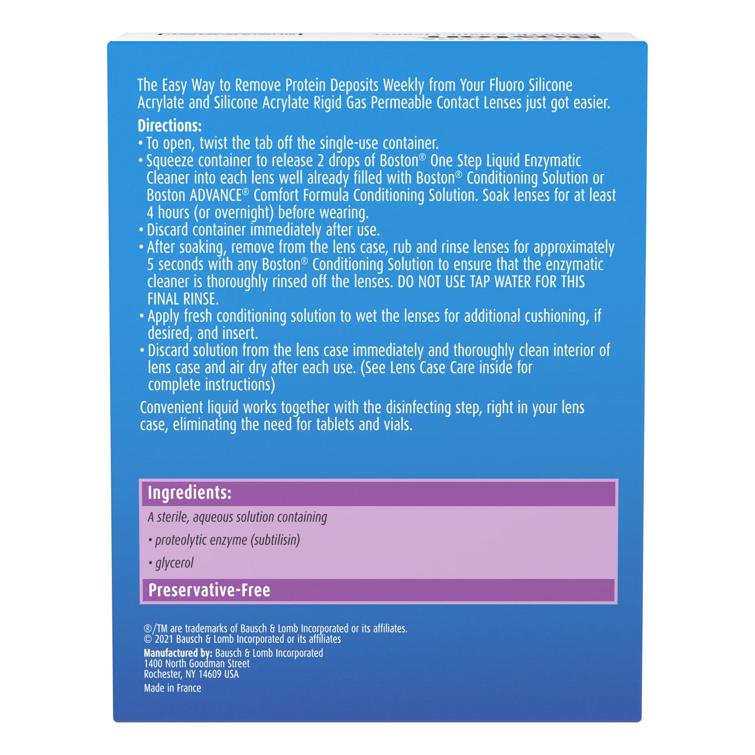 Details: Boston� One Step Liquid Enzymatic Cleaner is a simple and convenient way to remove protein deposits from your rigid gas permeable contact lenses. Designed to be used directly in your lens case while disinfecting, this cleaner eliminates the need for enzymatic tablets and separate vials. The clear, odorless formula is preservative free and helps maintain contact lens wearing comfort. Item contains a 15-week supply and is for use with all Boston Conditioning Solutions: Boston Original Conditioning Solution or Boston ADVANCE Conditioning Solution. To use, after daily cleaning with Boston Original Cleaner or Boston ADVANCE Cleaner and rinsing, place lenses in lens case and fill to top with any fresh Boston Original Conditioning Solution or Boston ADVANCE Conditioning Solution. Detach one single-dose unit and squeeze container to release 2 drops of Boston One Step Liquid Enzymatic Cleaner into each lens well. Soak lenses for 4+ hours or overnight to ensure proper cleaning and disinfecting. After removing lenses from lens case, rub and rinse lenses for approximately 5 seconds with any Boston Conditioning Solution to ensure that the enzymatic cleaner is thoroughly rinsed off the lenses. Apply fresh Conditioning Solution to wet the lenses for additional conditioning, if desired, and insert. For full instructions, see information printed inside the product carton. For fluoro silicone acrylate and silicone acrylate rigid gas permeable contact lenses. Not for use with soft (hydrophilic) contact lenses.