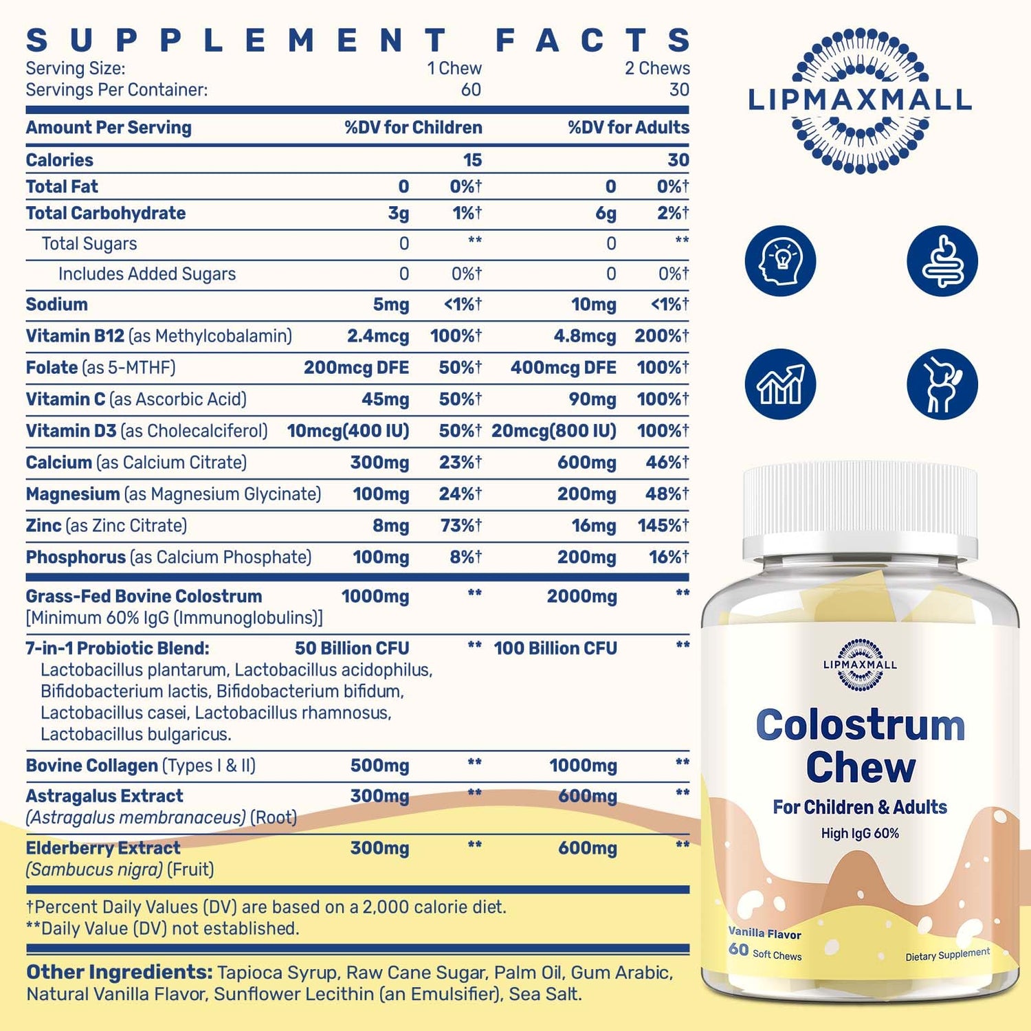 Bovine Colostrum Chews Supplement with 60% IgG for Humans Women Men Kids- for Immune, Gut, Bone, Joint, Cognitive, Overall Growth, from Grass-Fed Cows & Vanilla Flavor, 60 Soft Chews