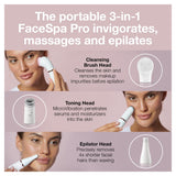 Details: The Braun FaceSpa Pro is the World's 1st 3-in-1 facial epilation, cleansing & skin toning device. Gently remove facial hair by the root with the epilator attachment for long-lasting smooth skin. The facial cleansing brush removes make-up while the MicroVibration head works with your serum or cream for skin-toning effects.**Better application of your skin care product vs manual