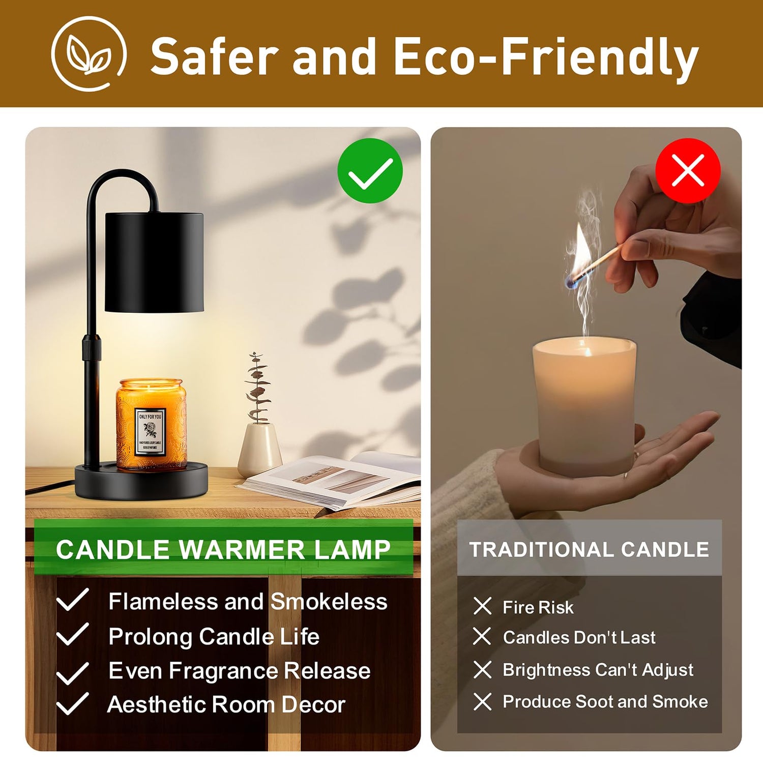 - 【Flexible Height Adjustment & Beautiful Design】 The free lifting bracket of this candle warmer lamp with timer can be easily adjusted in height to accommodate any size candle. In addition, it adopts the fashionable combination of wooden base, metal body and sleek lampshade, which is modern and atmospheric. The lamp candle warmer is suitable for a variety of occasions, and also a perfect home decor for bedroom, living-room, study room, kitchen, office or anywhere you frequent.