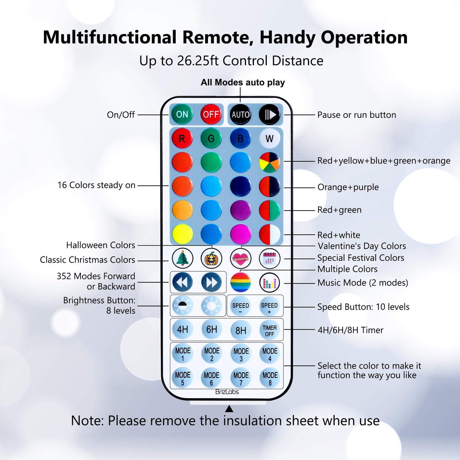 - Different Timer Options & Memory Function: Color changing string lights have a memory function, no need to repeat settings. Set "4H" "6H"& “8H” by remote, the Christmas fairy lights will be automatically on for 4/6/8 hours and off for 20/18/16 hours per day. Press the "Time OFF", and the timer will be canceled. Note】While the timer is activated, the blue indicator light inside the adapter will be on; while the timer is canceled, the blue indicator light is off.