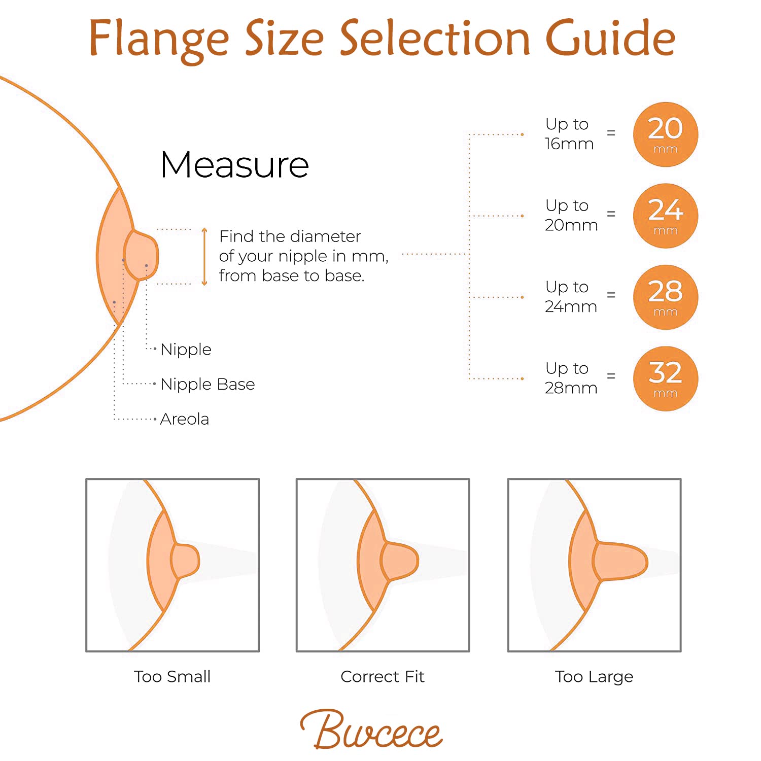- Choose right flange size:Your breasts may change between the third trimester and after giving birth. Also, your breasts may change through your breast pumping journey.So it's important to observe how your nipples look during a pumping session.Correctly measure and choose the right flange size.We offer 24mm flange and 28mm flange two Size selection to fit most moms.