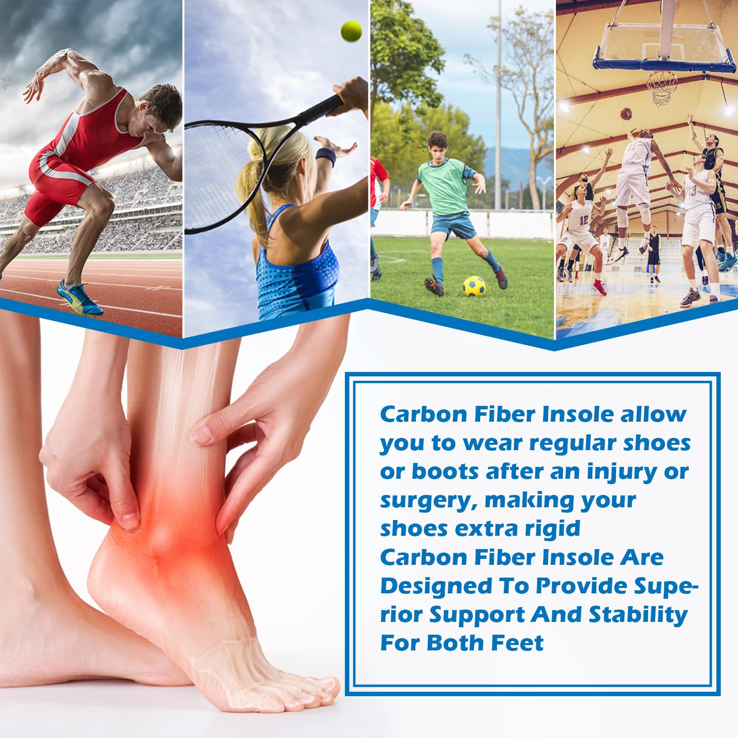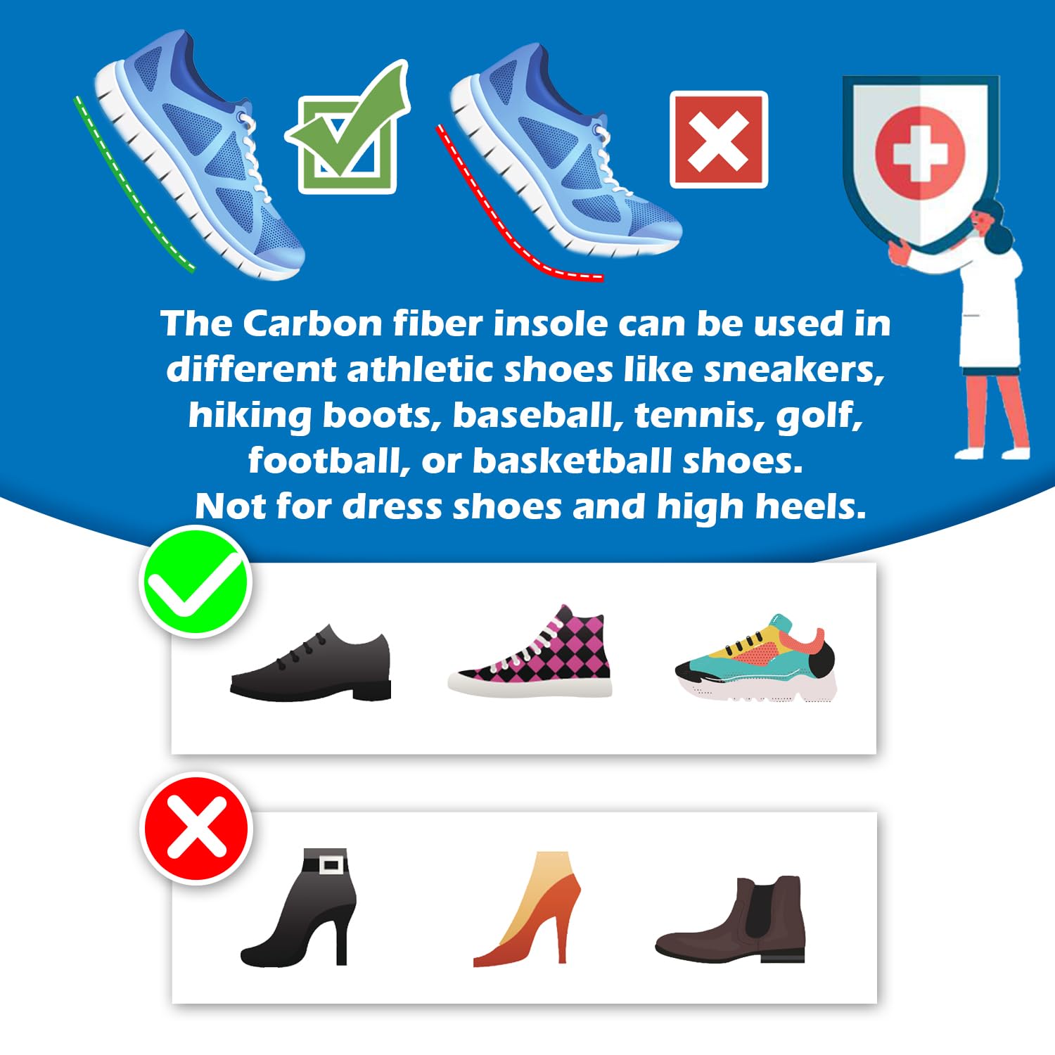 - 3.CHOOSE RIGHT SHOES: For extra comfort, use this carbon fiber insoles underneath your original removable sole.The front and back are exactly the same just flip it over,it can insert the shoes.The Carbon fiber insole can be used in different athletic shoes like sneakers, hiking boots, baseball, tennis, golf, football, or basketball shoes.Not suitable for high heels Slippers