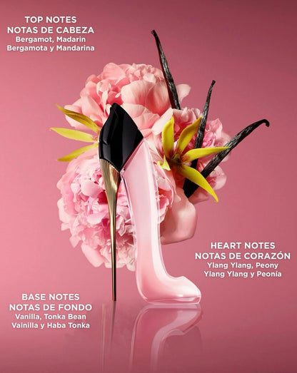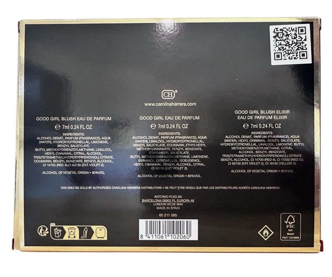 Details: Carolina Herrera Good Girl Gift Set (3 X 0.24 Oz) GIFT SET INCLUDES: Good Girl Eau de Parfum Mini, 0.24 oz.; Good Girl Blush Eau de Parfum Mini, 0.24 oz.; Good Girl Blush Elixir Eau de Parfum Mini, 0.24 oz. FRAGRANCE FAMILY: Floral. KEY NOTES: Good Girl: Jasmine Sambac, Almond, Tonka Bean; Good Girl Blush: Bergamot, Mandarin, Ylang Ylang, Peony, Vanilla; Good Girl Blush Elixir: Rose, Vanilla, Patchouli.