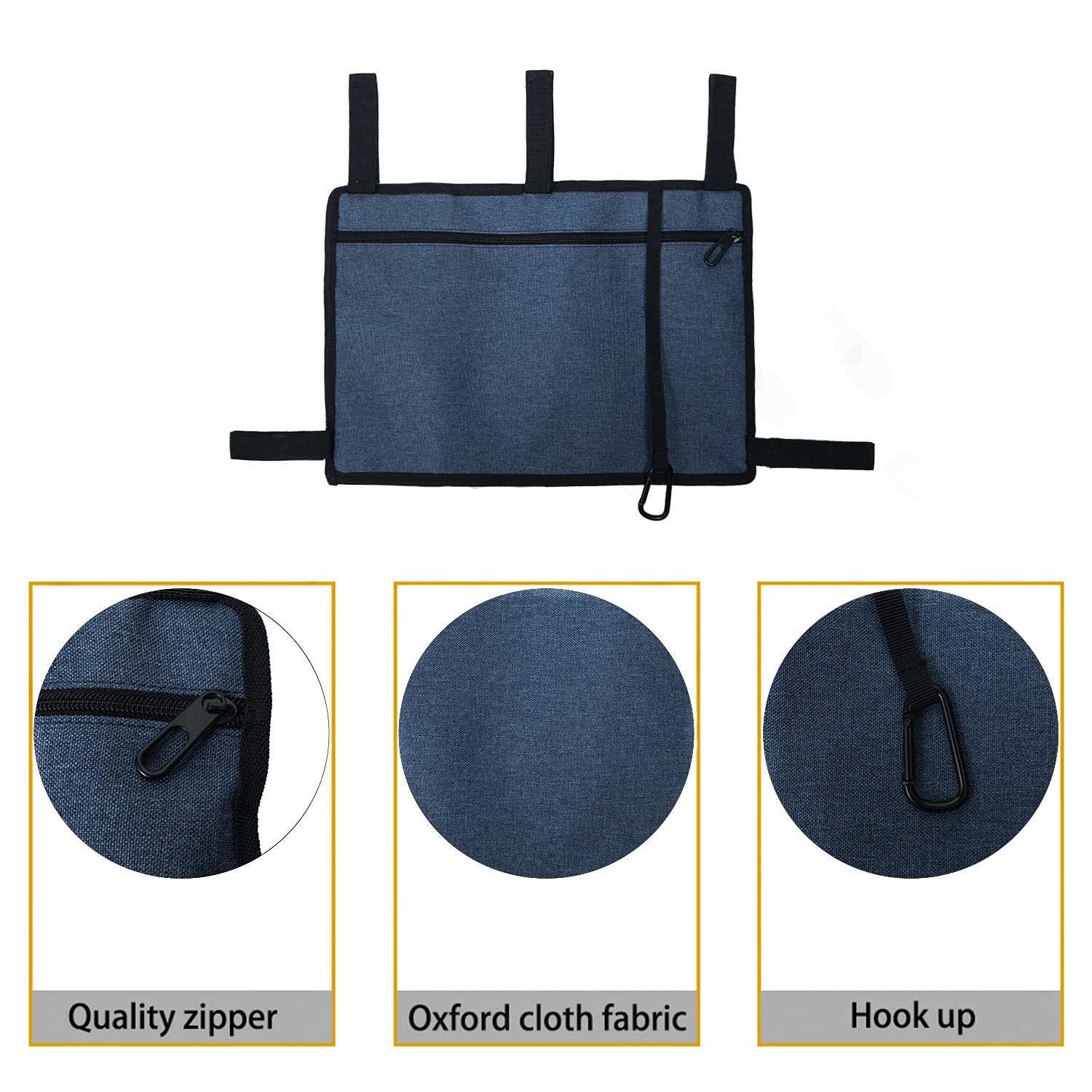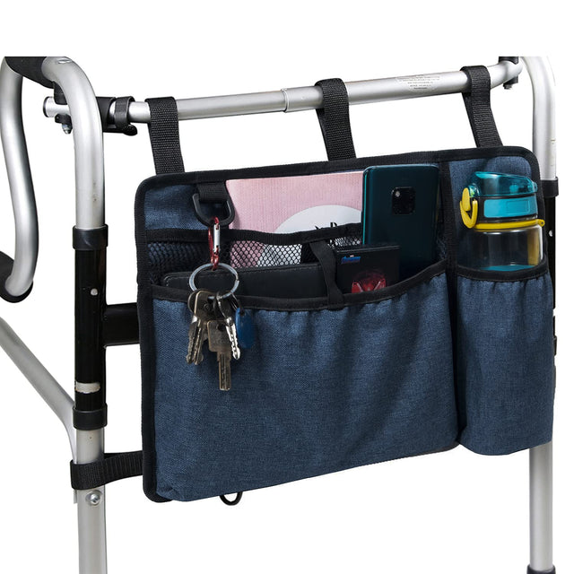Details: Walker Bag Wheelchair Pouch Armrest Accessories Basket Hand Free Storage Bags with Cup Holder for Rollator, Wheelchairs, Folding Walkers Suit for Elderly, Seniors, Handicap, Disabled Feature: Pockets for Large Storage,Unique double sided design for 4 pockets, you can easily sort your items and put them into different pockets like newspaper, pill organizer,book,phone,pen and so on Five Velcro Straps Attach on the Walker for More Stable,great gift for seniors, adults,and disable. Machine Washable and fits all walkers style,Adjustable side straps allow bag to easily attach to the front of any walker style, including bariatric walkers, standard walkers and dual point folding walkers Color: Blue Including: Walker bag x 1 Piece