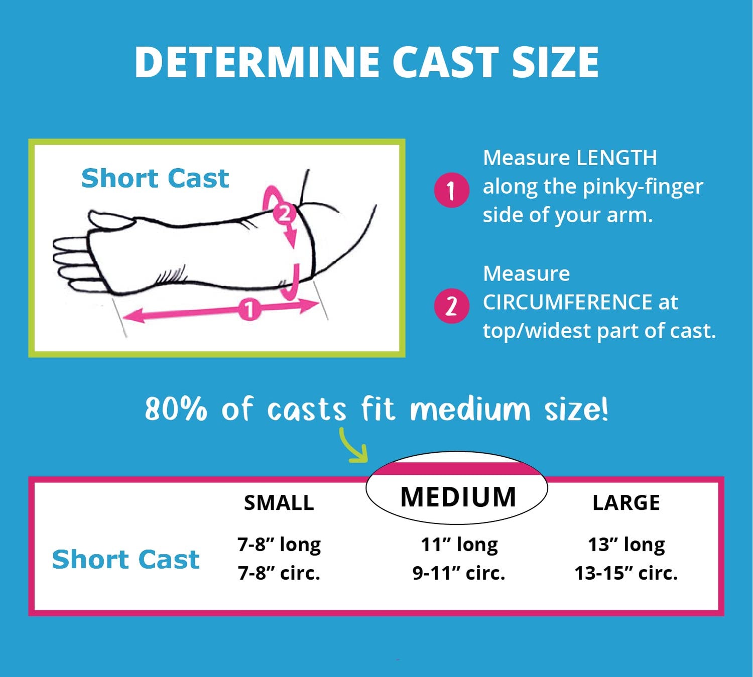 - SHORT ARM CAST COVER SIZING - BELOW THE ELBOW - Three Sizing Options - SMALL - 7-8" Length X 7-8" Circumference; MEDIUM - 11" Length X 9-11" Circumference; LARGE - 13" Length X 13-15" Circumference. Long cast covers available for casts beyond the elbow.