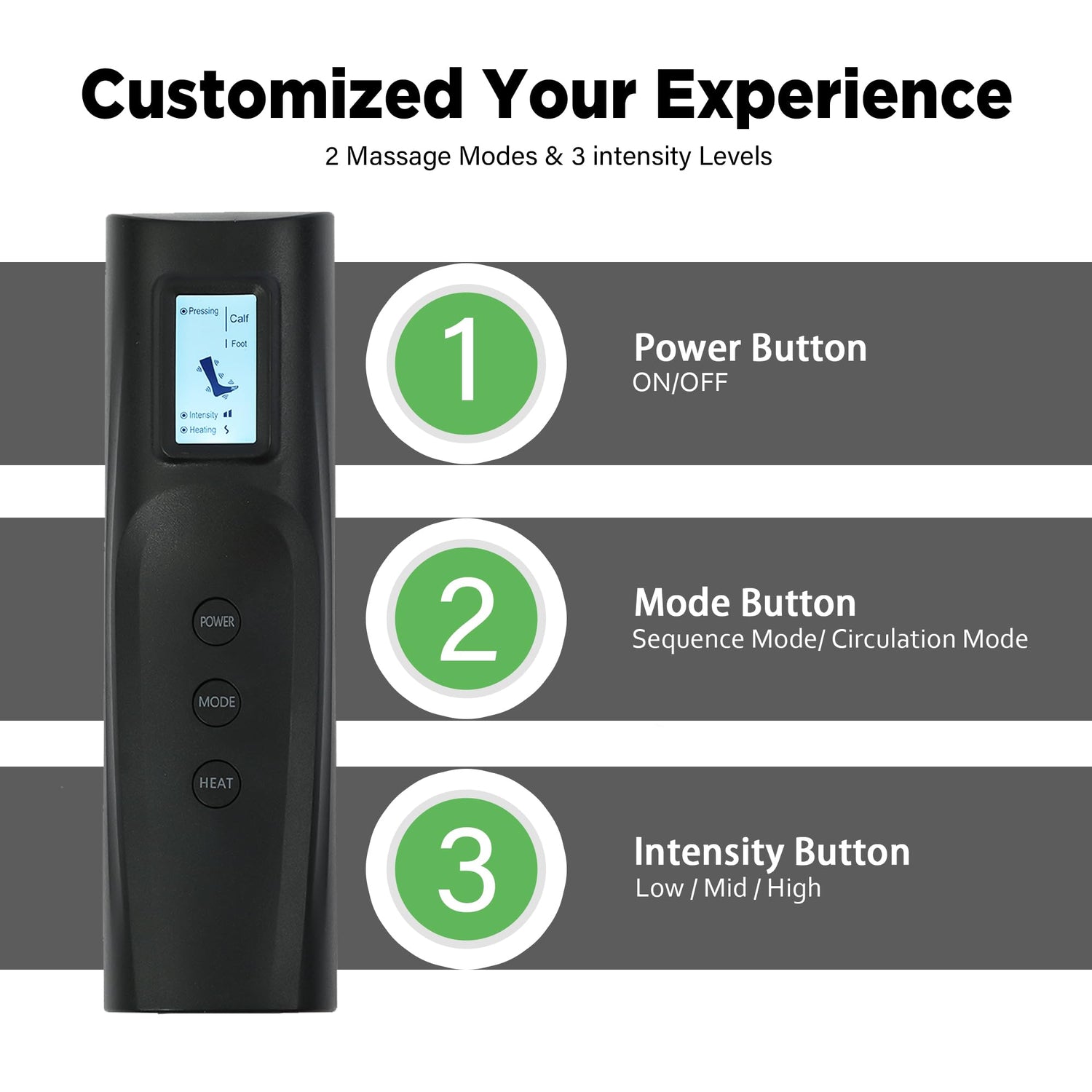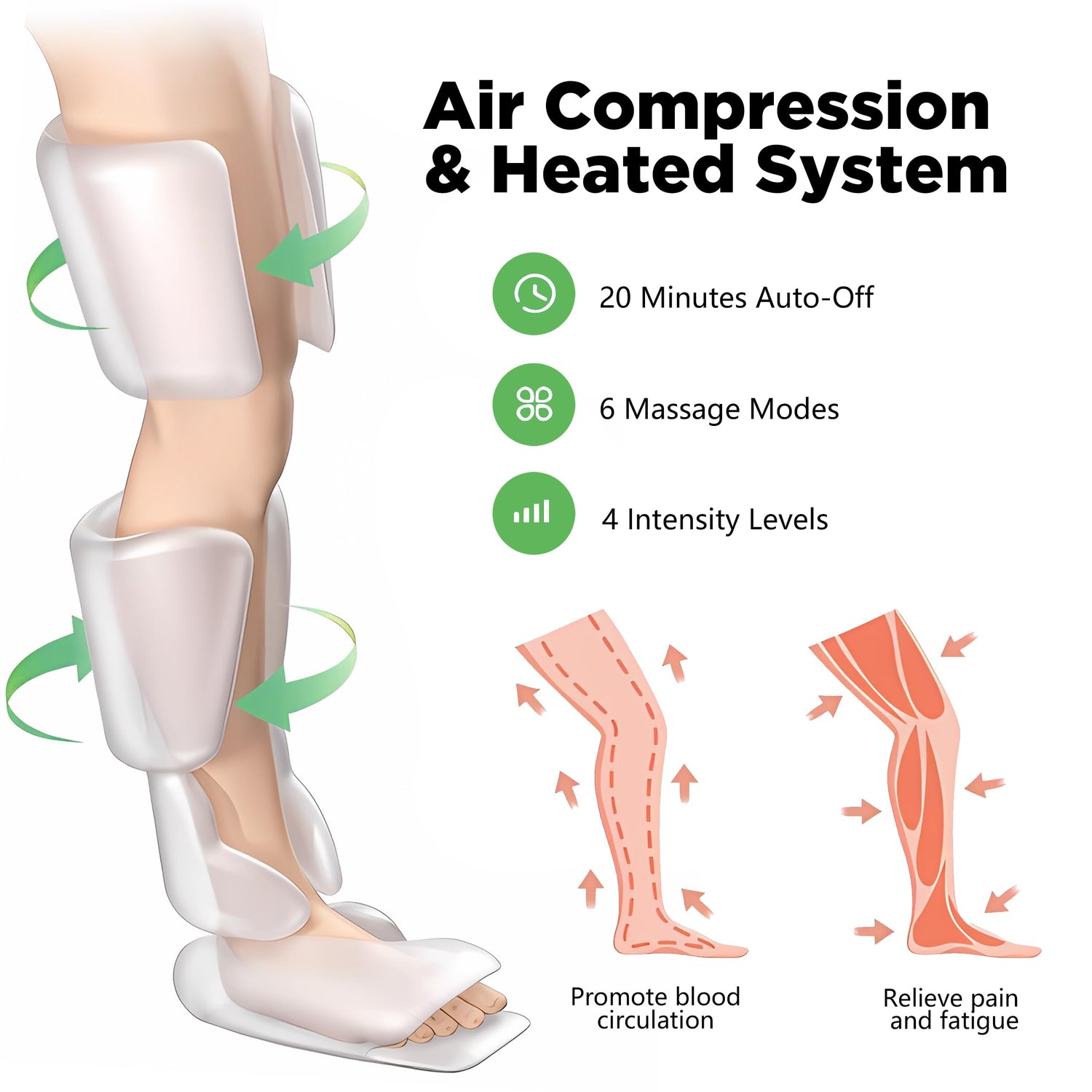 - 【Leg Air Compression Massager】3 in 1 leg massager (with heat & compression) combines air compression therapy with heat therapy to work on feet, calves and thighs at the same time.360 full coverage boot design gives you an all-around relaxing massage that effectively improves blood circulation and helps relieve muscle fatigue and pain.