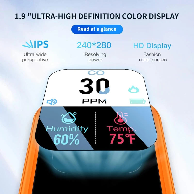 - Electrochemistry working method. More accurate detection of carbon monoxide. There is no delay, real-time monitoring, and data is refreshed every 2 seconds shows on the color HD 1.9’’ screen, so that you can always know the air quality of the environment.