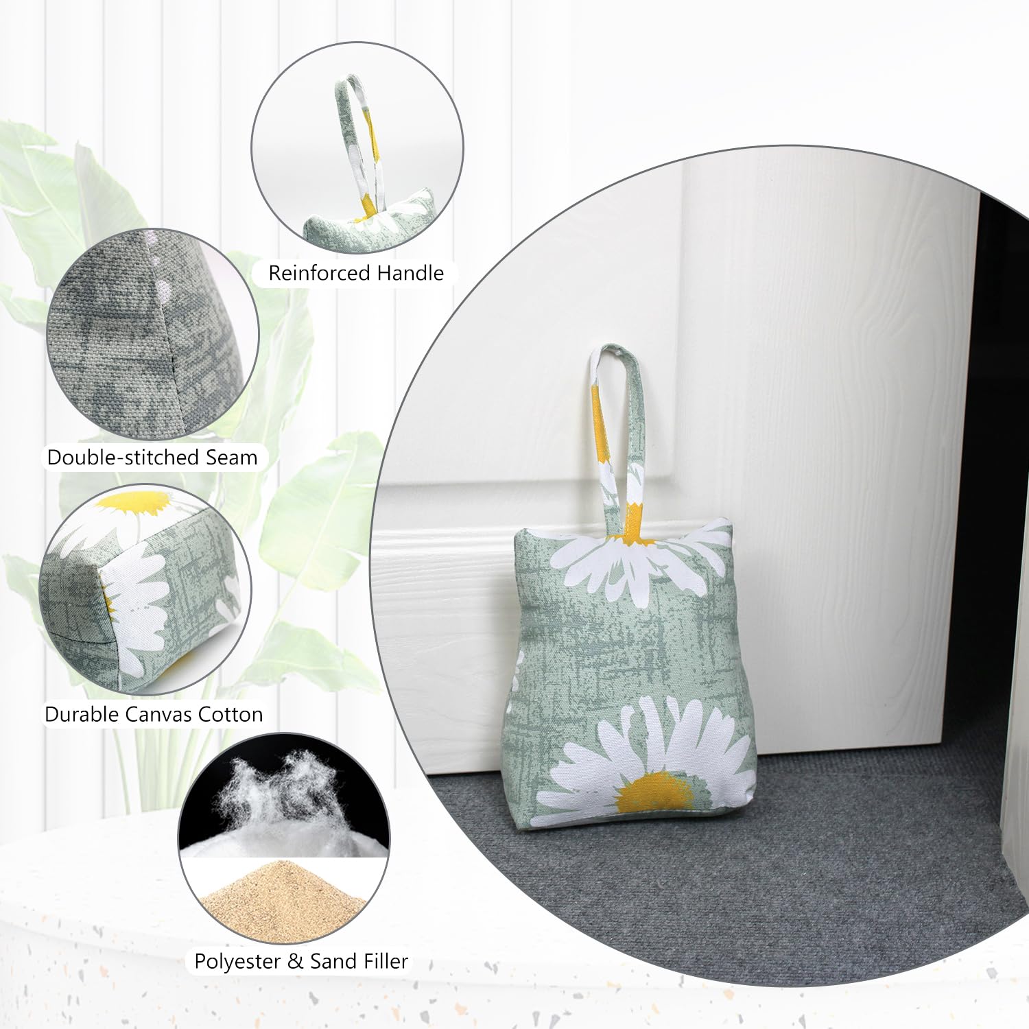 - WEIGHT MATERIAL: This decorative trapezoid door stopper shell is made of canvas cotton, filled with polyester and sand, weighing around 1kg/2lb allowing the door stopper to be placed upright, and measures around 15*20cm/5.9*7.8in. A chic handle makes moving the door stopper easy. The stuffed door stopper can easily block the door or keep your door open.